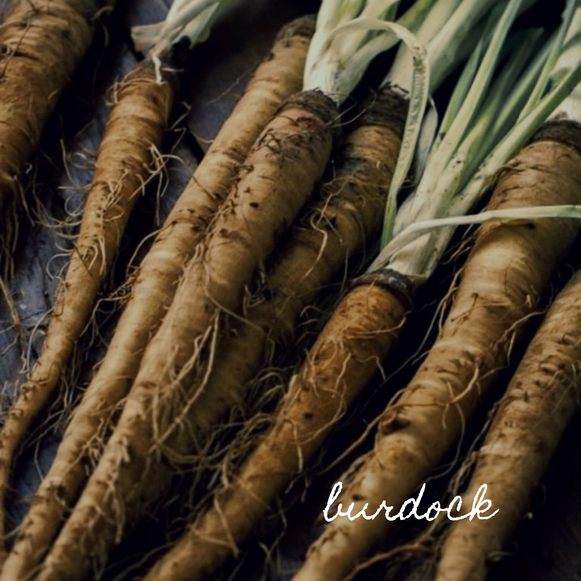 ~Burdock root is native to Europe and Asia, and has been part of folk medicine traditions in Japan, India, and by Native Americans. It has a long history of use as a blood purifier, to eliminate toxins from the body, as well as acting as a healing agent. It's herbal actions are oily, bitter, and warming, and is good for stagnation in gut, liver, gallbladder, lymph, extra cellular fluid, kidney and skin. Burdock is deeply supportive to digestive health, helps stimulate bile production, the digestion of fats, and is very nutrient dense.